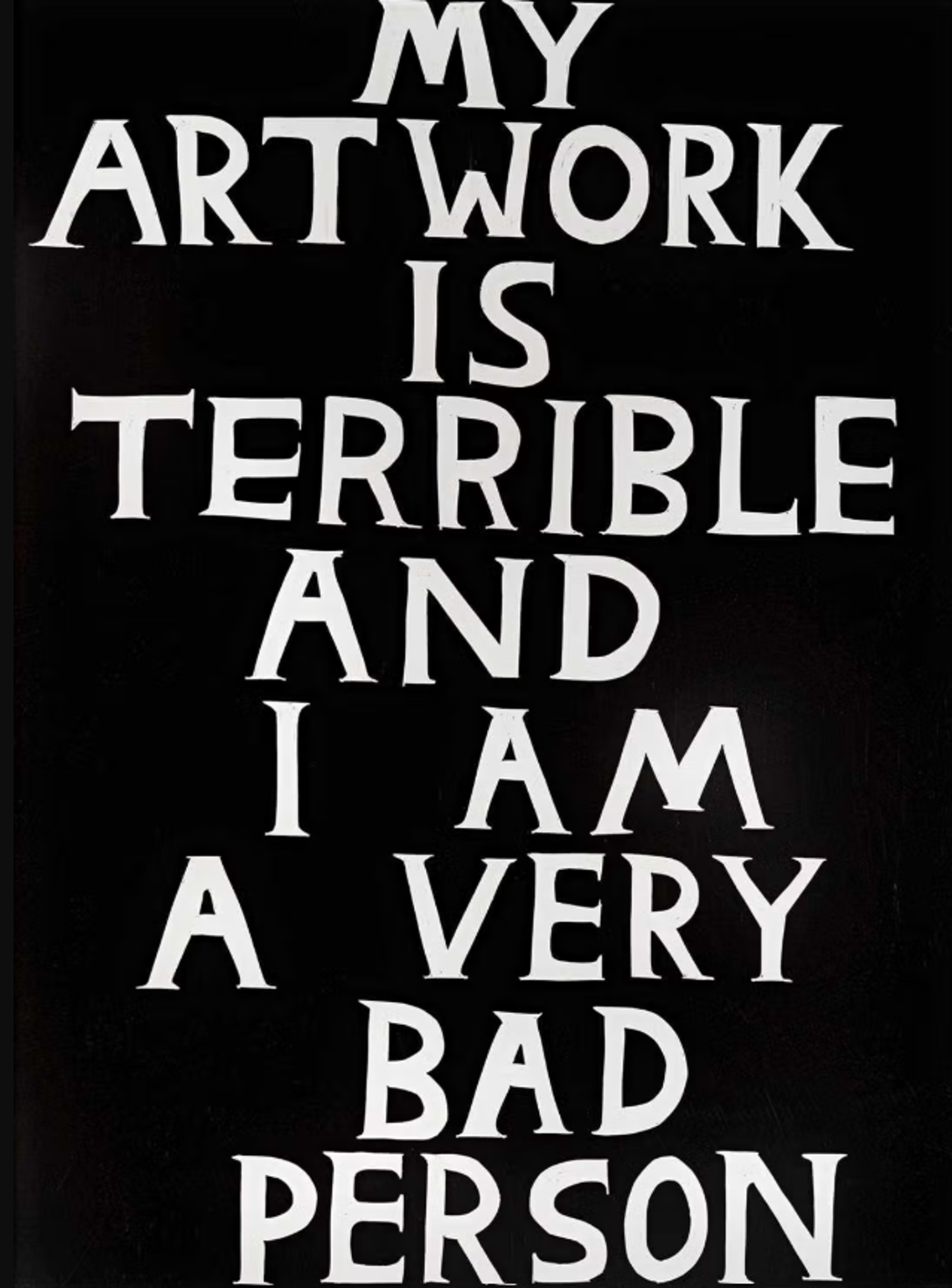 My Artwork Is Terrible © David Shrigley 2018Self-deprecating and satirical, My Artwork Is Terrible is one of Shrigley's most absurd works. Set against a black backgrounds are the words, ”My artwork is terrible and I am a very bad person” - a direct commentary on the nonsensical, irrational, yet undeniably amusing qualities of his artwork. Before any critic can respond, Shrigley does it for them. Despite the troubling message contained in the work, it achieved £10,500 when it was sold at Tate Ward's Urban and Contemporary Art auction on 29 September 2021. The wry print achieved its £900 high estimate almost tenfold, and therefore speaks to the hold Shrigley's work has on the Contemporary Art market, even if Shrigley himself thinks it is terrible.